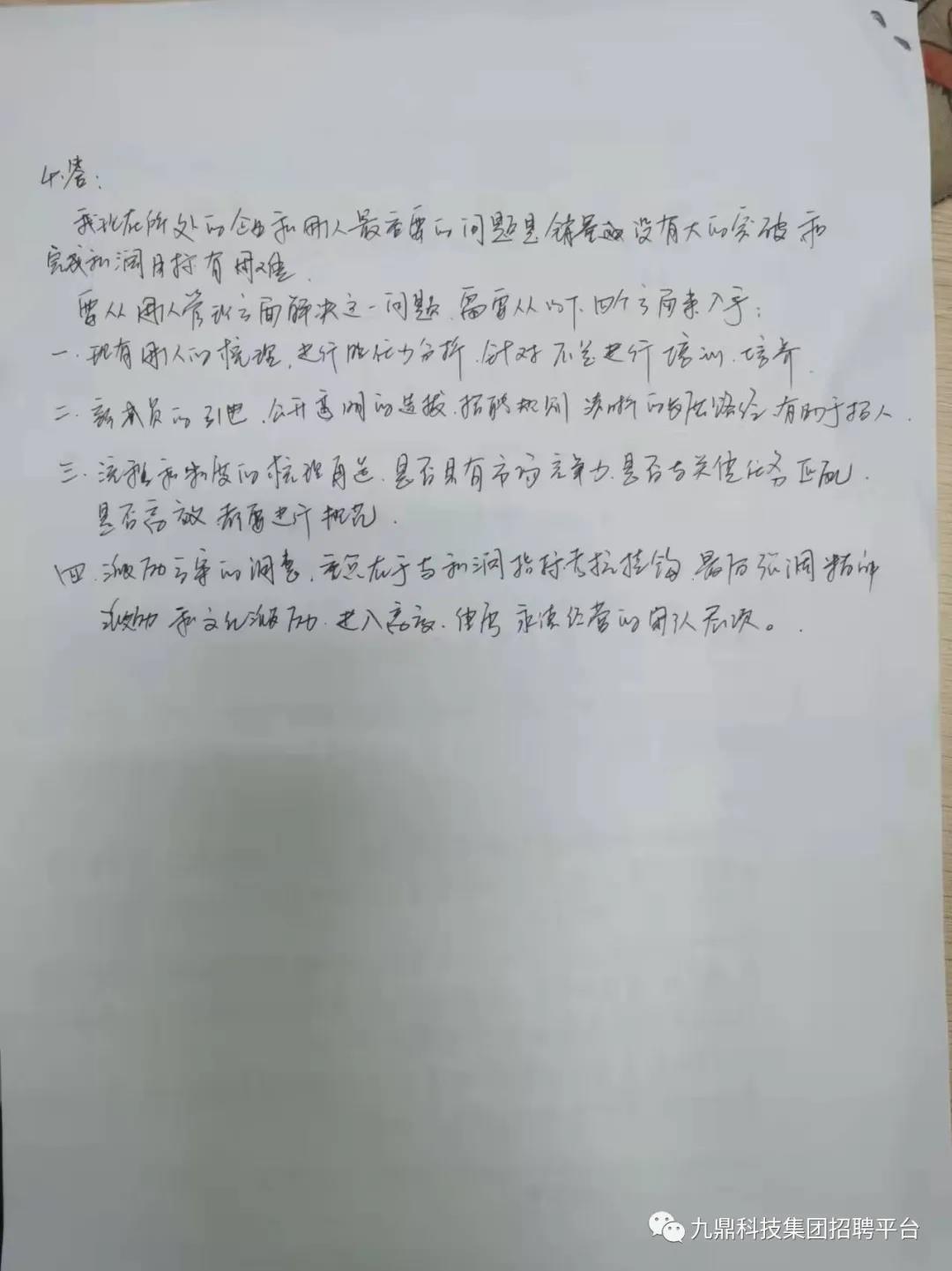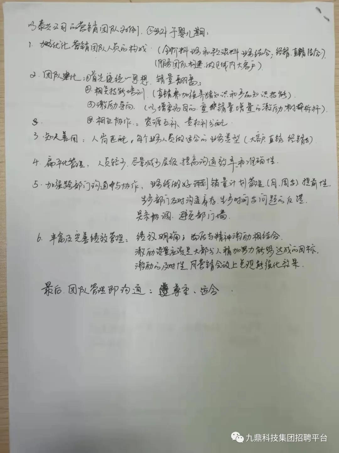四天的培訓(xùn)時(shí)間是短暫的,留給大家更多的是思考如何立足本職工作,做好2022年的工作計(jì)劃,在今后的工作中比學(xué)趕超,做出成績(jī)。 另外,九鼎集團(tuán)中高管招聘工作還在繼續(xù)進(jìn)行中,如果您有興趣歡迎自薦或者推薦身邊的優(yōu)秀人員給我們。聯(lián)系方式可以投遞簡(jiǎn)歷至文末招聘郵箱,或直接在本公眾號(hào)回復(fù)消息即可~~