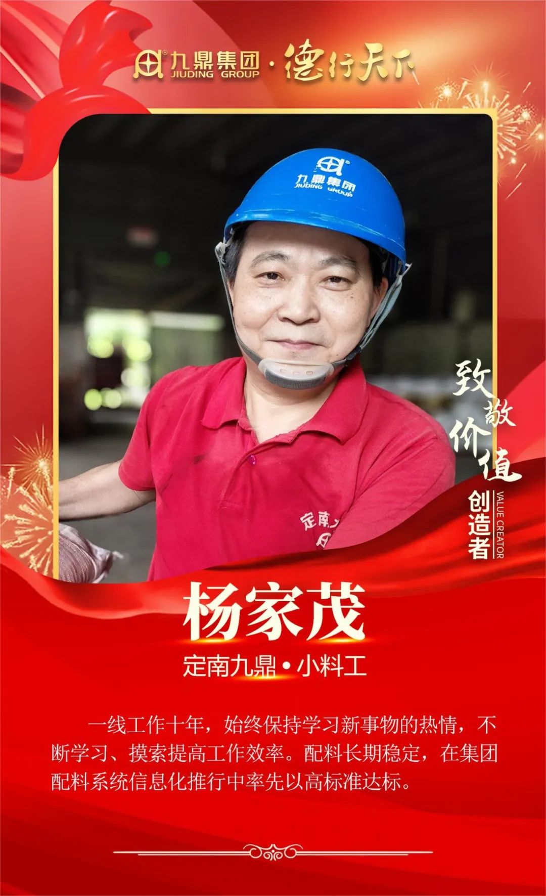 用汗水澆灌收獲,以實干篤定前行。為大力弘揚九鼎文化,鼓舞激勵廣大九鼎人學習標桿、趕超先進,集團總部組織開展了“致敬價值創(chuàng)造者”勞動模范評選。經(jīng)嚴格篩選考察,授予楊家茂等30名員工2023年度“勞動模范”稱號。
